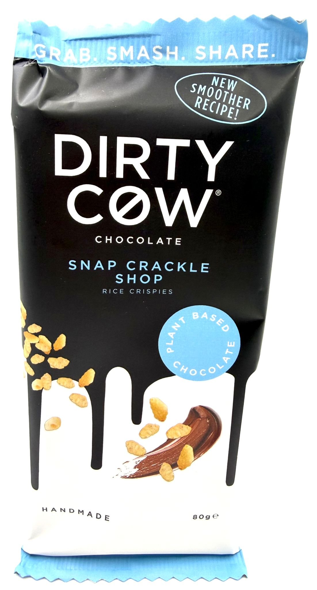 Light, crispy and seriously moreish, Dirty Cow Snap Crackle Shop blends smooth plant based chocolate with crunchy rice crispies for the perfect snap in every bite. Handmade using a smoother recipe, this bar delivers creamy cocoa flavour with a satisfyingly crisp texture. Ideal for grabbing, smashing, sharing or enjoying as a playful twist on a classic chocolate treat.