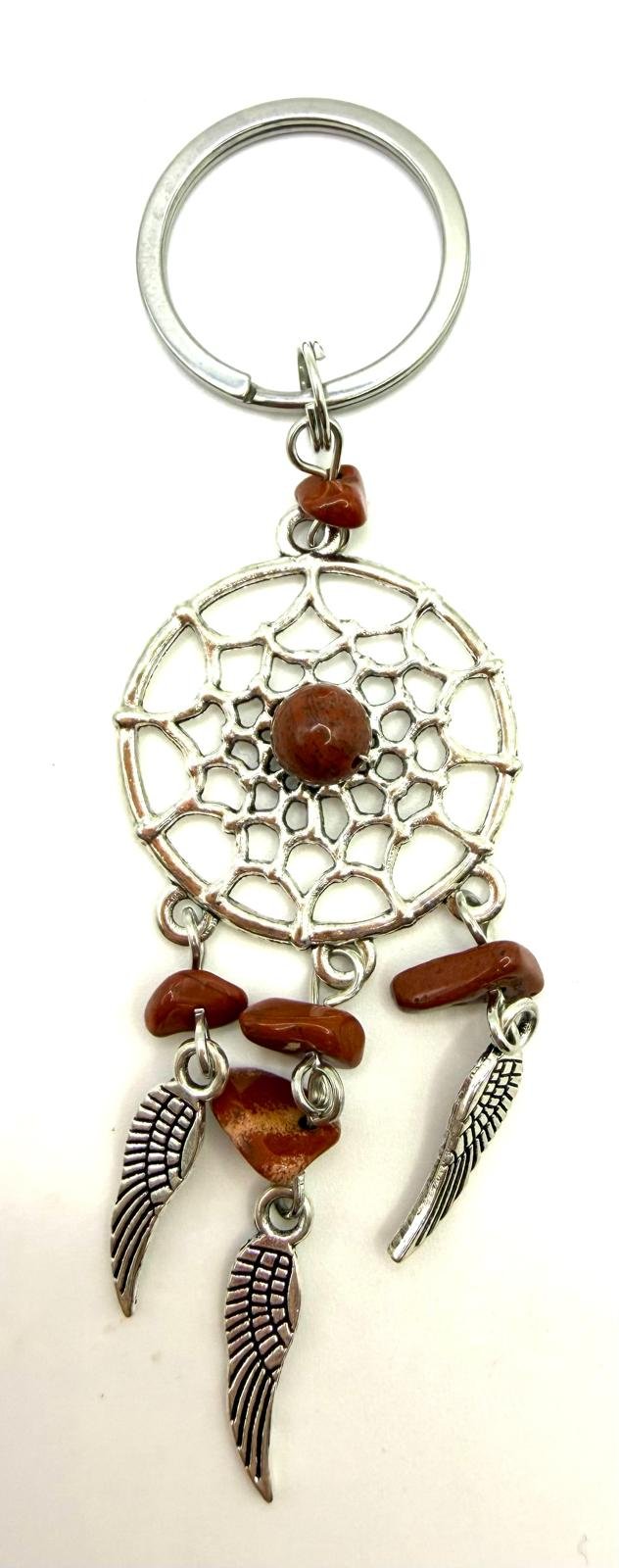 A striking dreamcatcher-style keyring featuring a silver-tone web design accented with warm brown stone beads. Finished with hanging feather charms and natural stone details that add texture and movement.