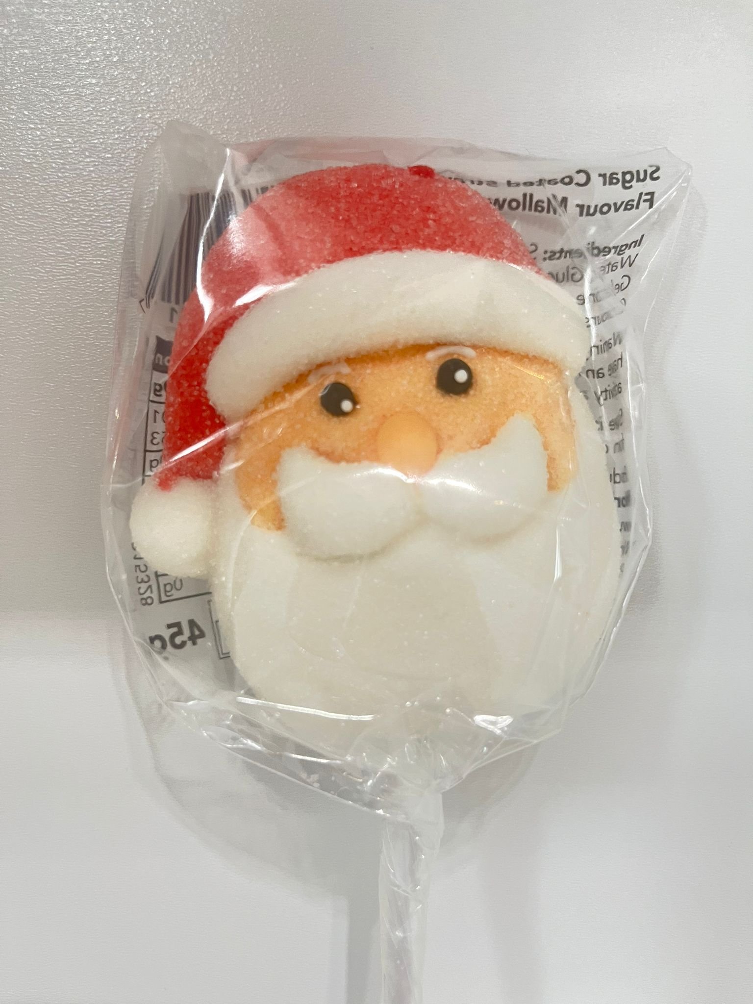 A festive, strawberry-flavoured mallow lollipop shaped like Santa Claus. Sweet, fun, and perfect for stocking fillers or holiday treats.
