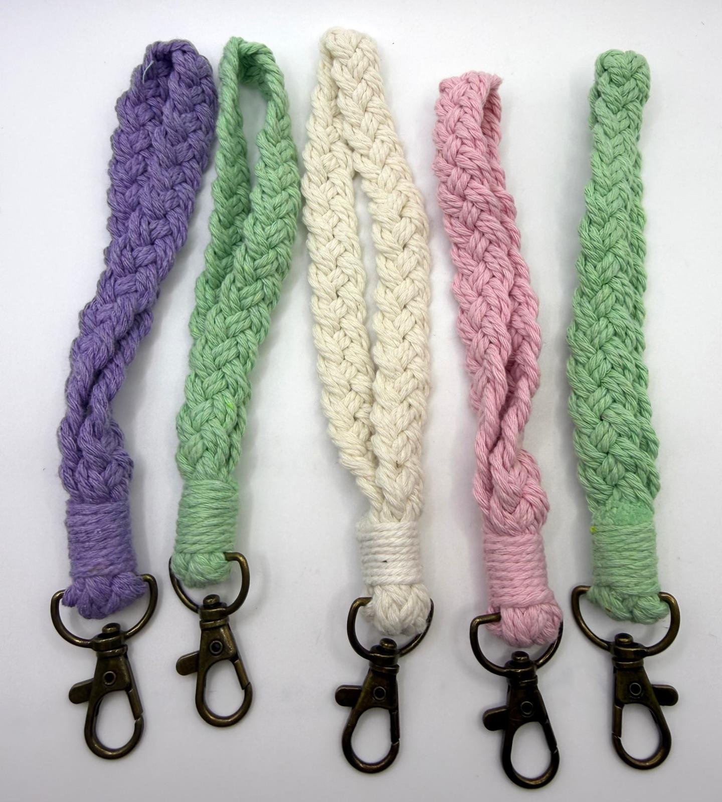 A beautifully handcrafted macramé wristlet keychain made from braided cotton cord and finished with a sturdy metal clasp. Designed to slip comfortably over the wrist, it keeps keys secure and easy to find while adding a soft, stylish touch.