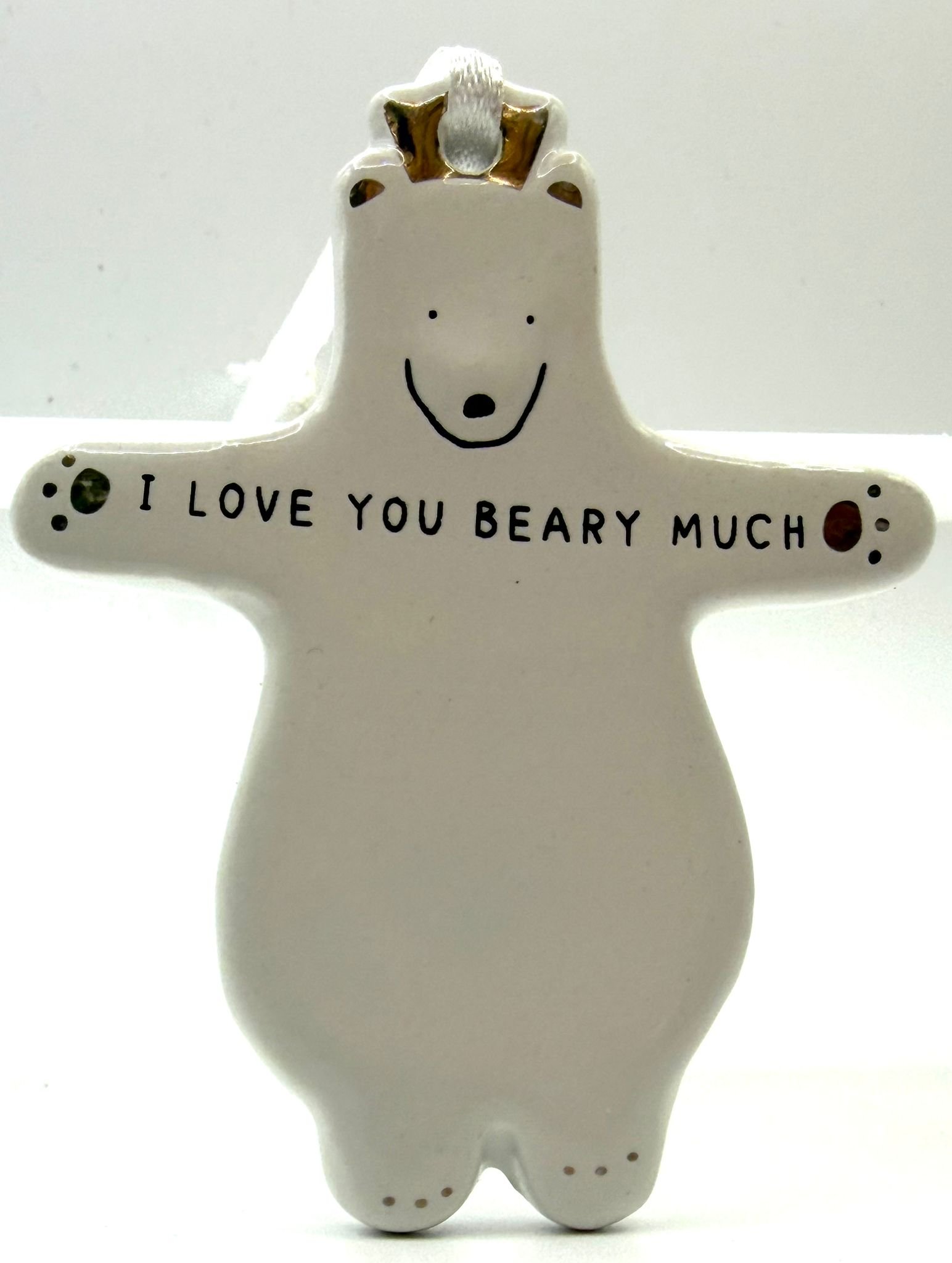 A charming ceramic bear decoration featuring the sweet message “I Love You Beary Much.” With its simple design and gentle expression, this decorative piece makes a thoughtful gift for loved ones or a lovely addition to shelves, desks, or seasonal displays.
