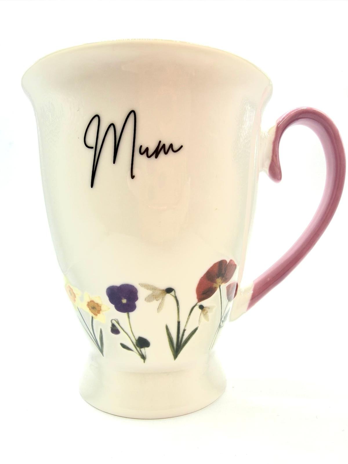 A charming ceramic pedestal mug designed especially for Mum, featuring delicate illustrations inspired by vibrant British wildflowers such as daisies, violets, snowdrops, and poppies. Finished in a soft pink tone with a graceful handle, this mug is perfect for enjoying a favourite hot drink. A thoughtful and practical gift for Mother’s Day, birthdays, or simply to show appreciation every day.