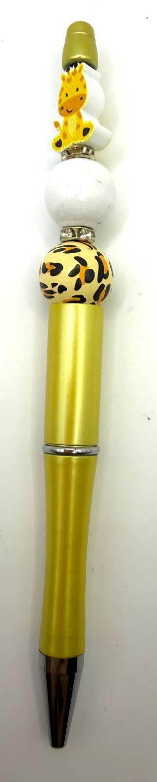 A bright and playful novelty pen featuring an adorable giraffe character topper, finished with coordinating animal-print and white beads. The metallic gold pen body adds a fun yet stylish touch, complemented by silver-tone detailing for a polished finish.