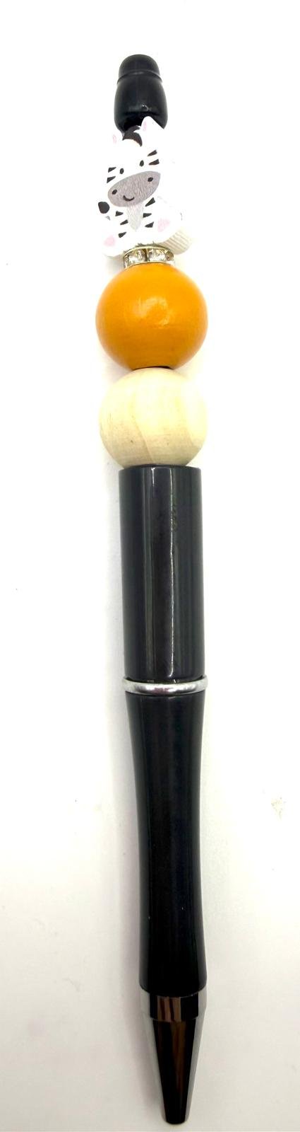 A fun and eye-catching novelty pen featuring a cute zebra character topper, paired with natural and warm-toned wooden beads. Finished with a sleek black pen body and silver-tone detailing, this pen combines playful charm with everyday practicality.