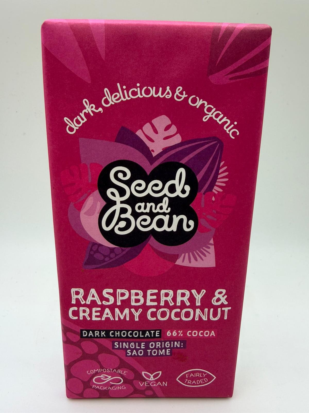 A vibrant and indulgent dark chocolate bar combining tangy raspberry pieces with smooth, creamy coconut. The rich cocoa base perfectly balances fruity sharpness and tropical sweetness, creating a beautifully rounded flavour experience. Crafted with organic, vegan, and fairly traded ingredients, and wrapped in fully compostable packaging, this bar is as ethical as it is delicious.