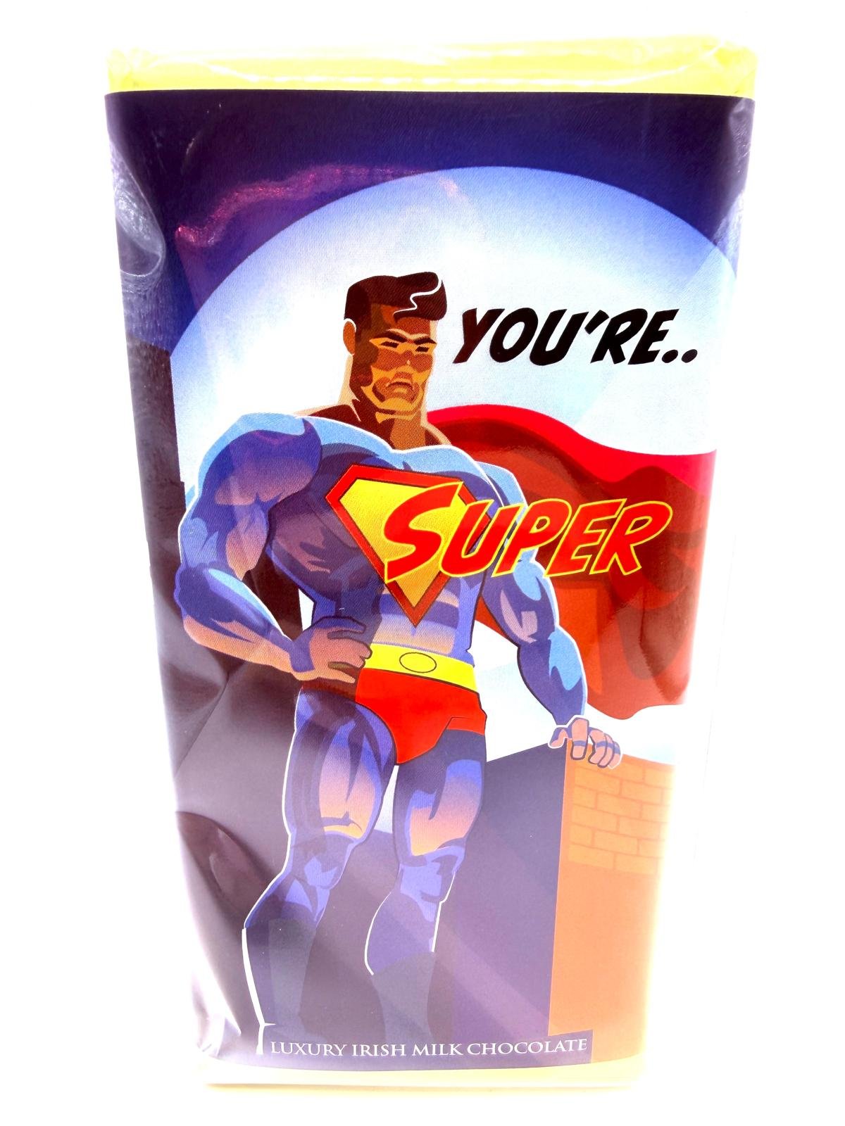 elebrate your everyday hero with this Sentiments Bar, made from smooth, creamy luxury Irish milk chocolate and wrapped in a striking superhero design. Featuring the message “You’re Super”, it’s the perfect way to recognise someone who goes above and beyond—whether that’s Dad, a partner, a friend, or a real-life legend.