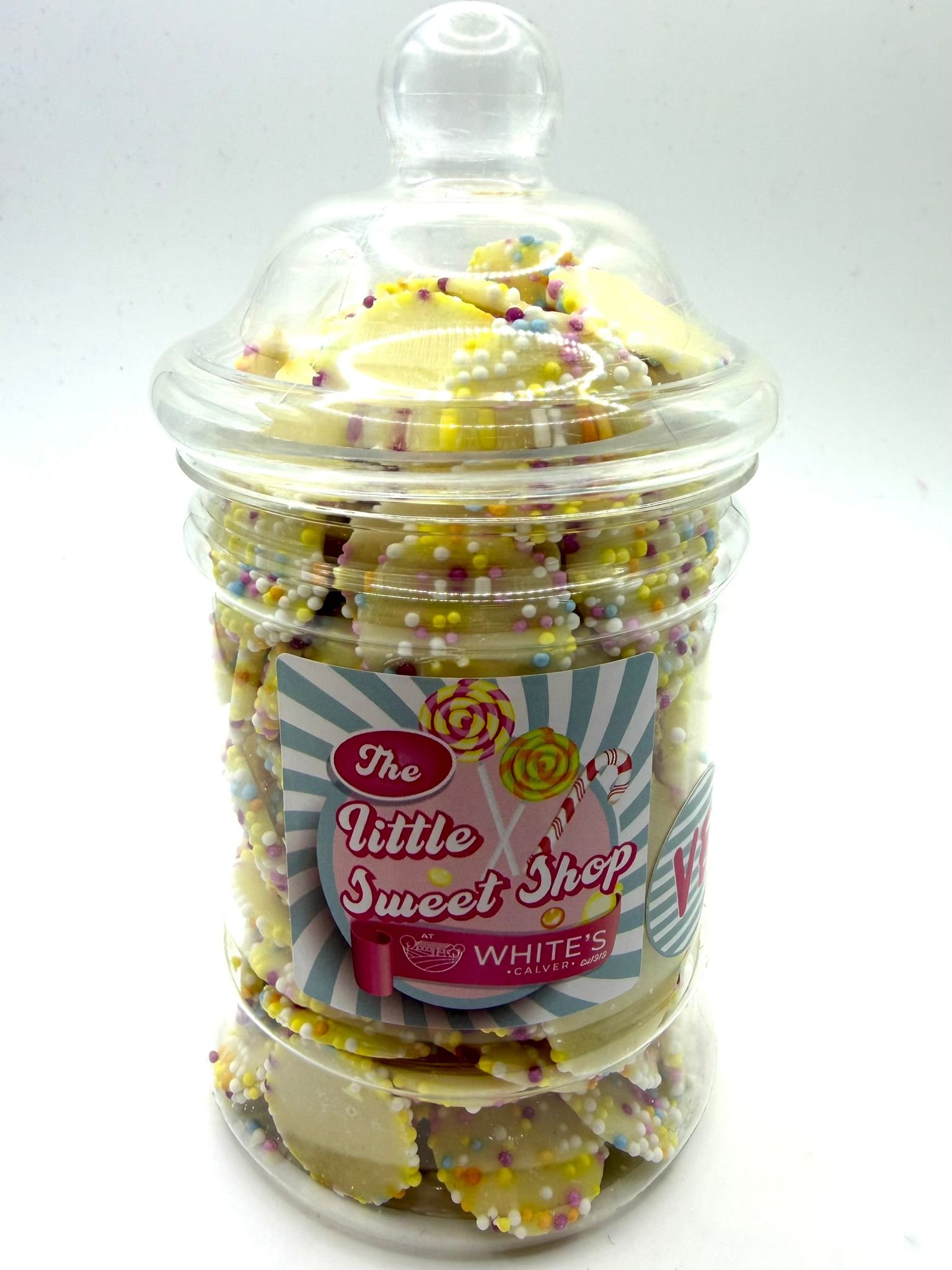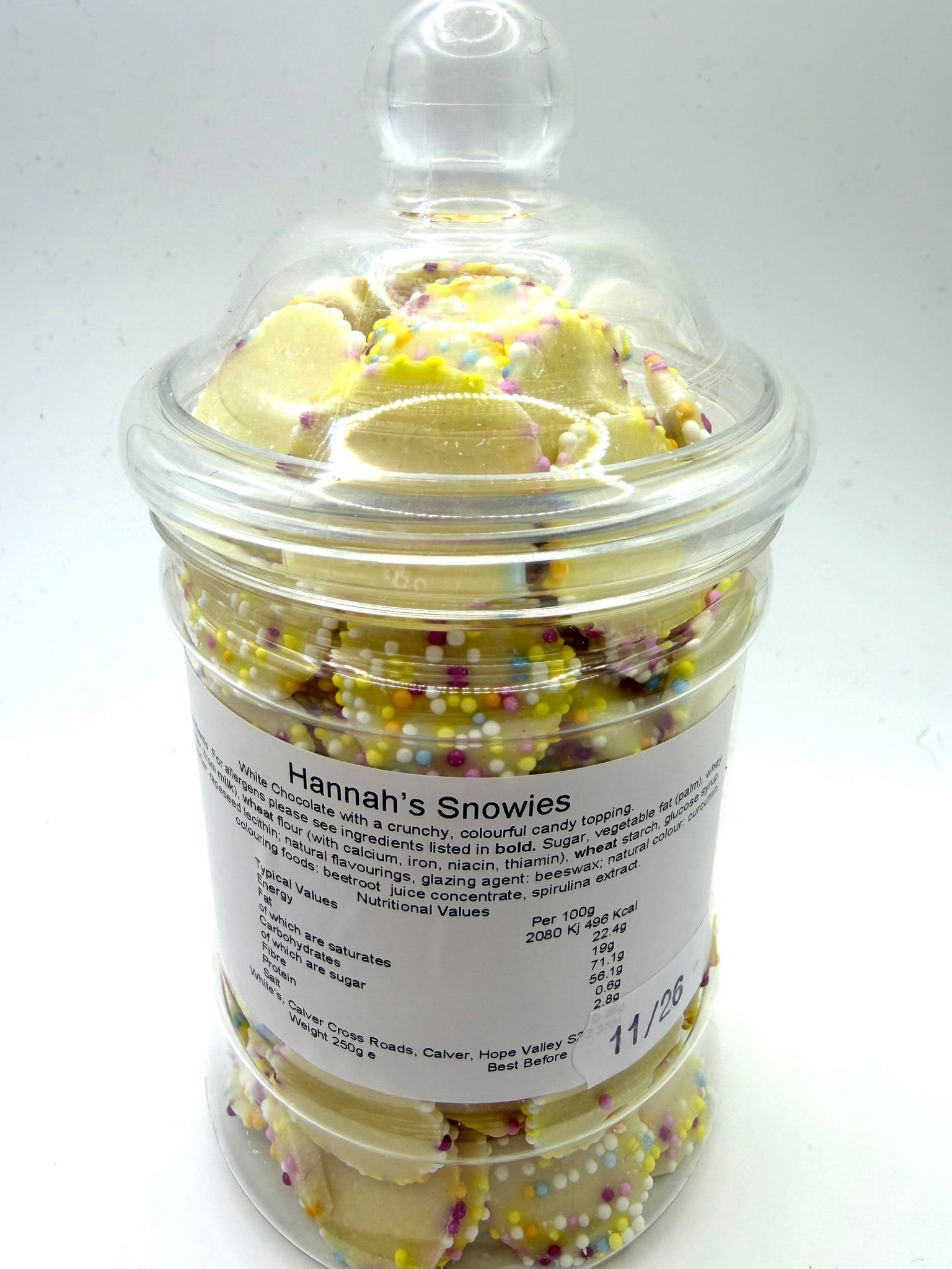 A cheerful jar of vegan white chocolate Snowies, coated in crunchy, colourful candy sprinkles for the perfect mix of smooth and crisp. Sweet, creamy, and irresistibly nostalgic, these dairy-free treats are a firm favourite for all ages. Ideal for gifting, sharing, or adding a little fun to your vegan chocolate stash.