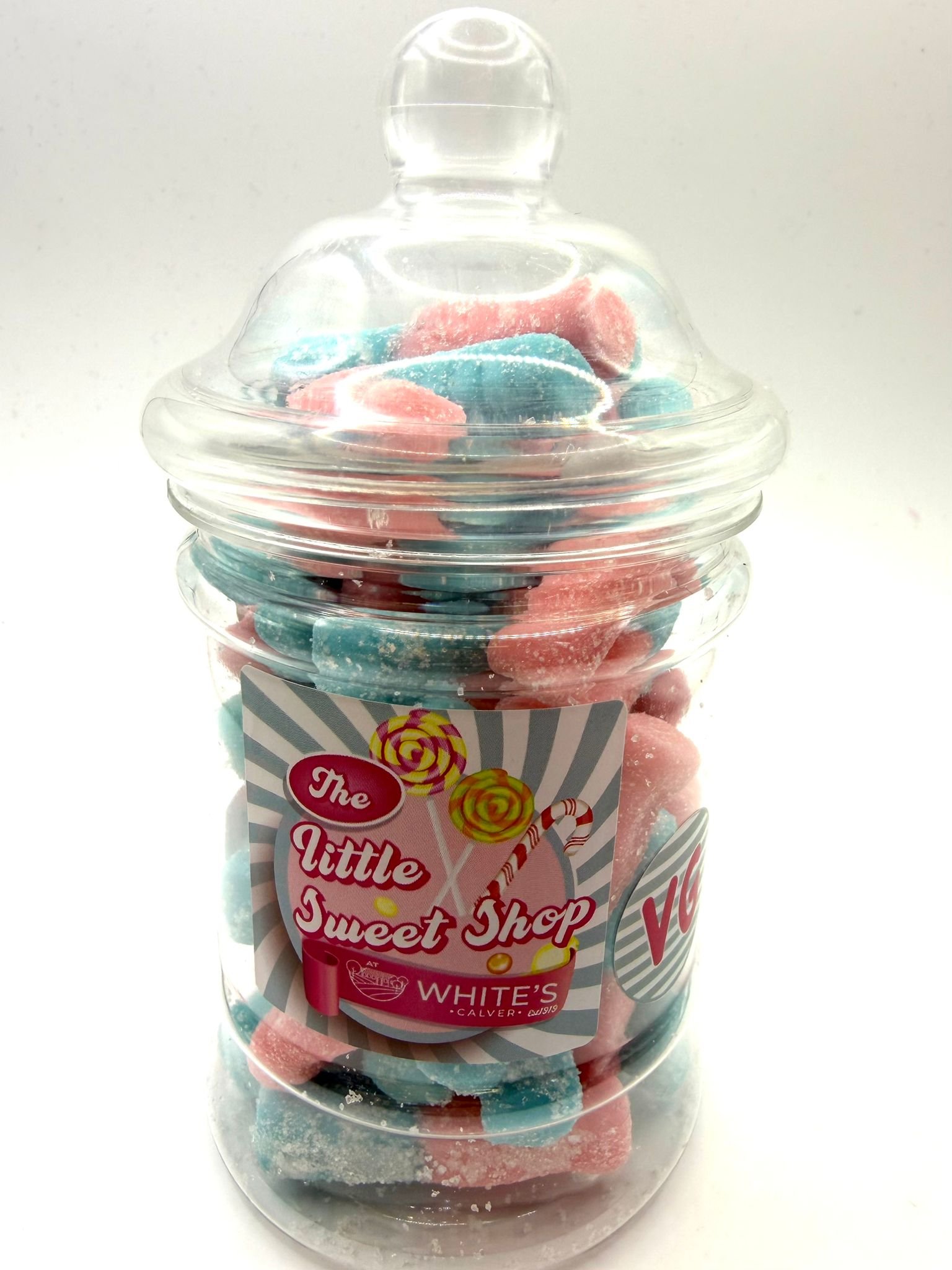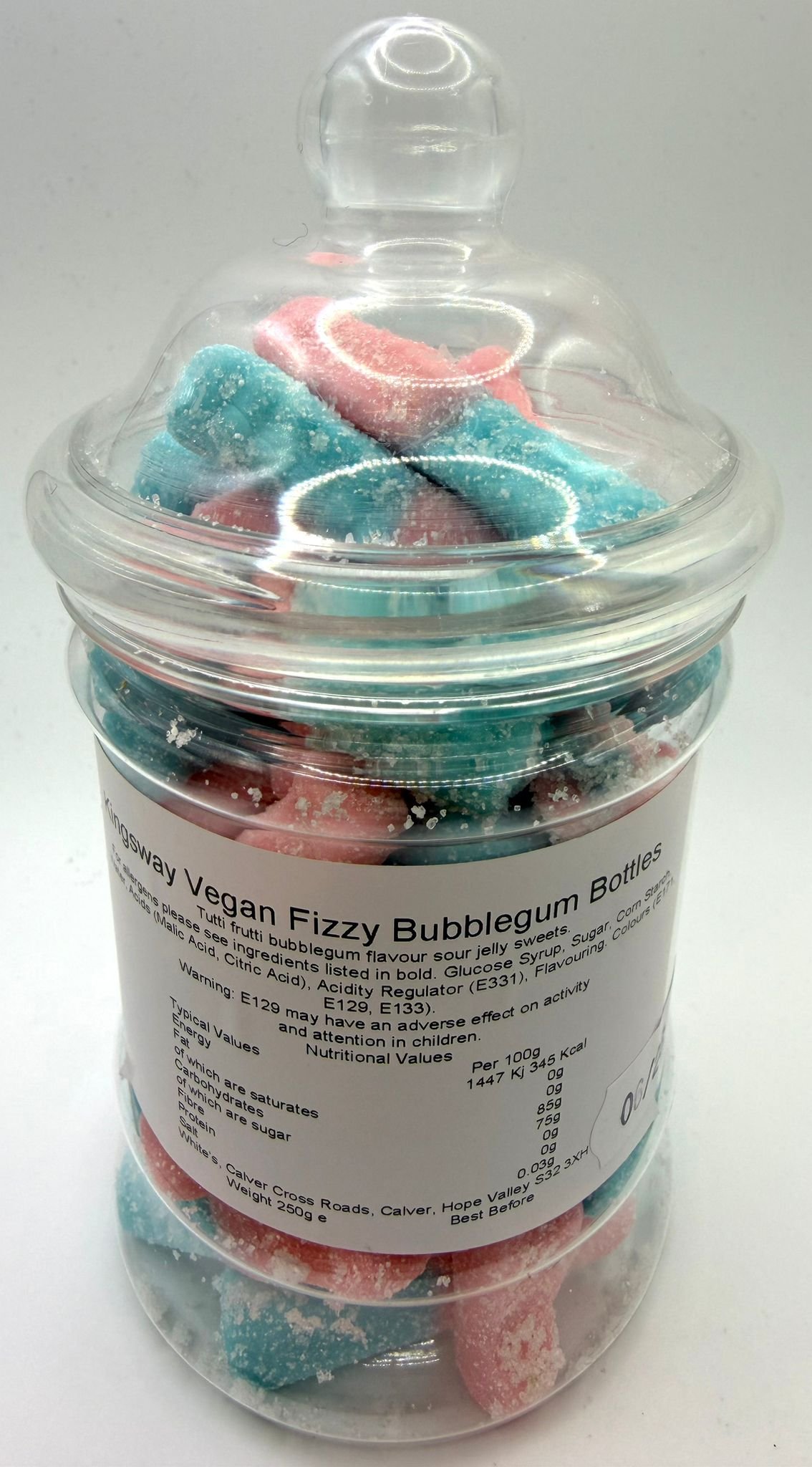 A fun and tangy jar of vegan fizzy bubblegum bottles, packed with bright pink and blue jelly sweets dusted in sour sugar. Bursting with classic bubblegum flavour and a fizzy kick, these chewy favourites are perfect for sharing, gifting, or adding a retro sweet-shop treat to your stash.