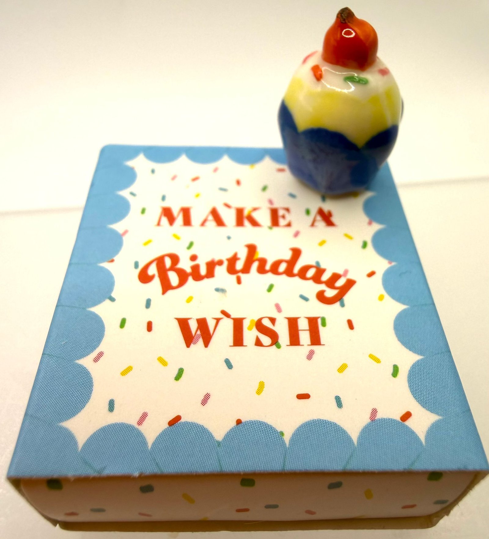 A charming little ceramic cupcake token, nestled inside a colourful matchbox-style gift box with the message “Make a Birthday Wish.” Bright, cheerful, and full of celebration vibes, this sweet keepsake is perfect for marking someone’s special day.