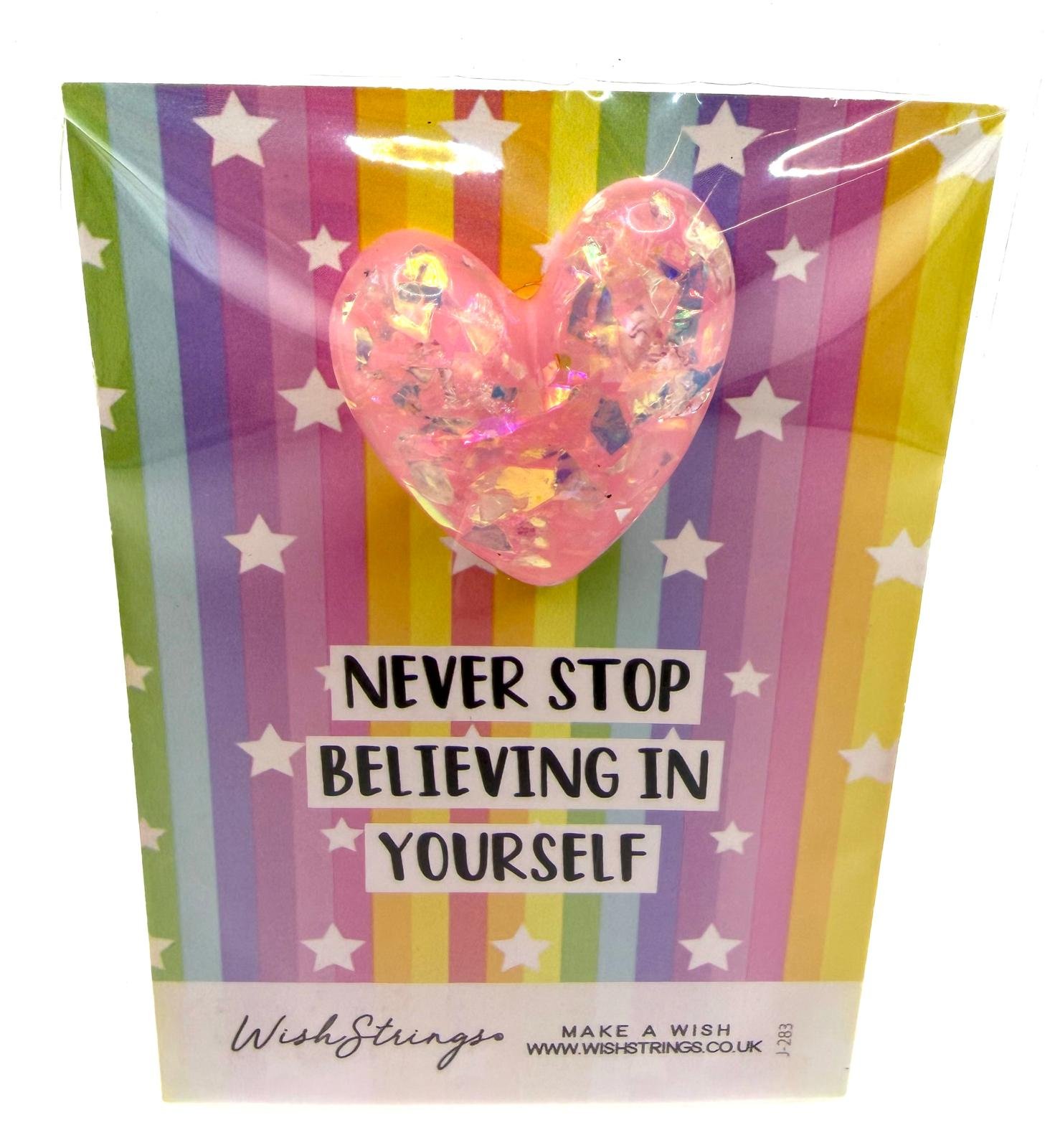 An uplifting Wishstrings keepsake designed to inspire confidence and positivity. Featuring a shimmering pink heart set against a colourful rainbow background, this thoughtful token carries the message “Never stop believing in yourself.”Perfect as a small encouragement gift for friends, family, or anyone who needs a reminder of their strength, it’s ideal to keep close in a pocket, bag, or on a desk as a daily boost of motivation.