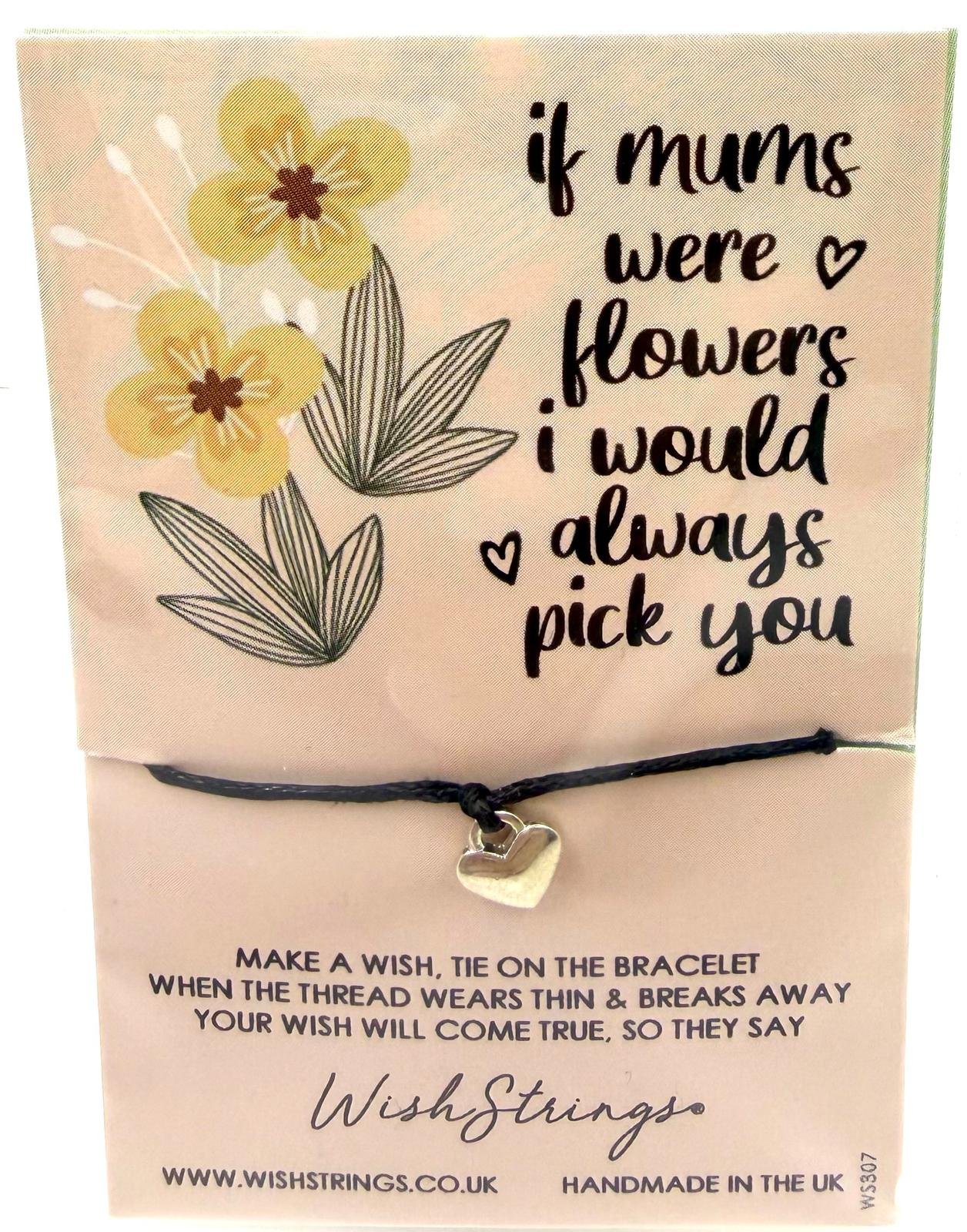 A thoughtful and heartfelt wish bracelet celebrating the love of a mum. This Wishstrings bracelet features a silver heart charm tied onto a black cord and is presented on a soft, floral-designed card with the message “If mums were flowers, I would always pick you.”