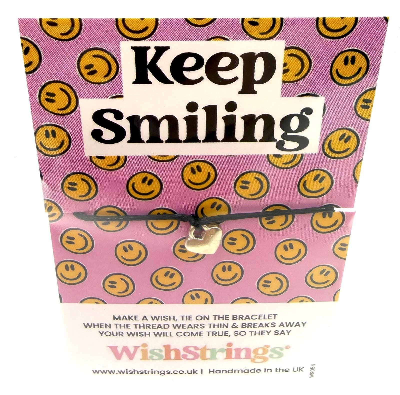 A cheerful Wishstrings bracelet designed to spread positivity and encouragement. Featuring a silver-tone heart charm on a simple black cord, this handmade bracelet comes mounted on a bright smiley-patterned card with the uplifting message “Keep Smiling.” Make a wish, tie it on, and when the thread wears thin and breaks, the wish is said to come true. A thoughtful little gift to brighten someone’s day or offer a reminder to stay positive.